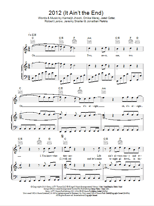 Download or print Jay Sean featuring Nicki Minaj 2012 (It Ain't The End) sheet music, chords and digital score arranged for Piano, Vocal & Guitar Chords. This Hip-Hop score includes 8 page(s).