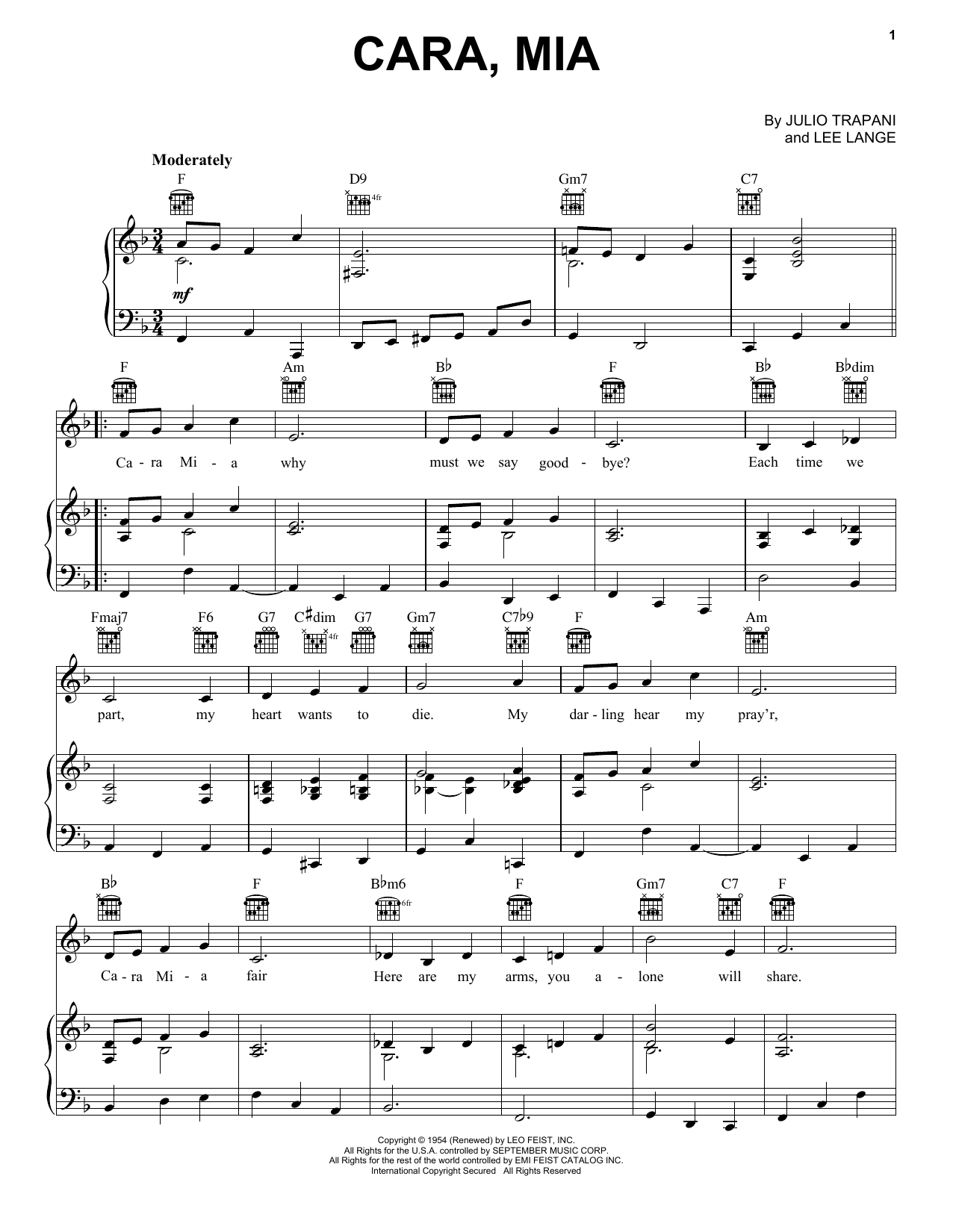 Download or print Jay & The Americans Cara, Mia sheet music, chords and digital score arranged for Piano, Vocal & Guitar Chords (Right-Hand Melody). This Pop score includes 2 page(s).