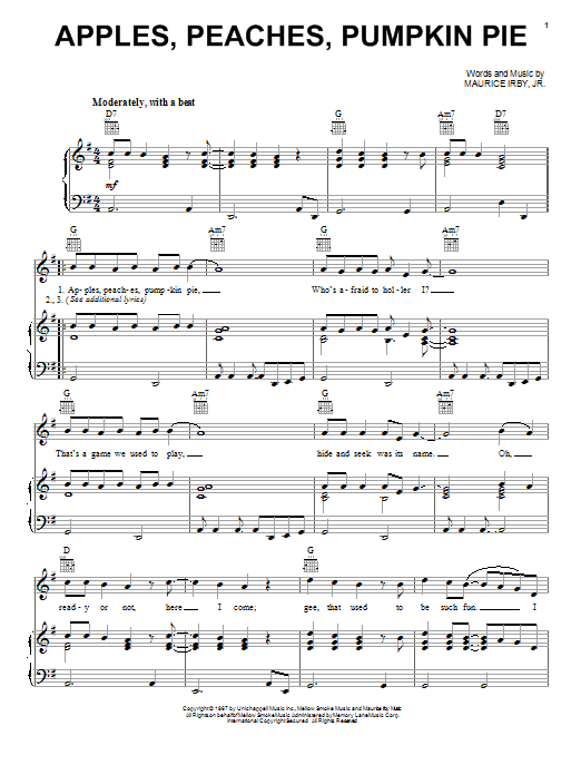 Download or print Jay & The Techniques Apples, Peaches, Pumpkin Pie sheet music, chords and digital score arranged for Piano, Vocal & Guitar Chords (Right-Hand Melody). This Pop score includes 2 page(s).