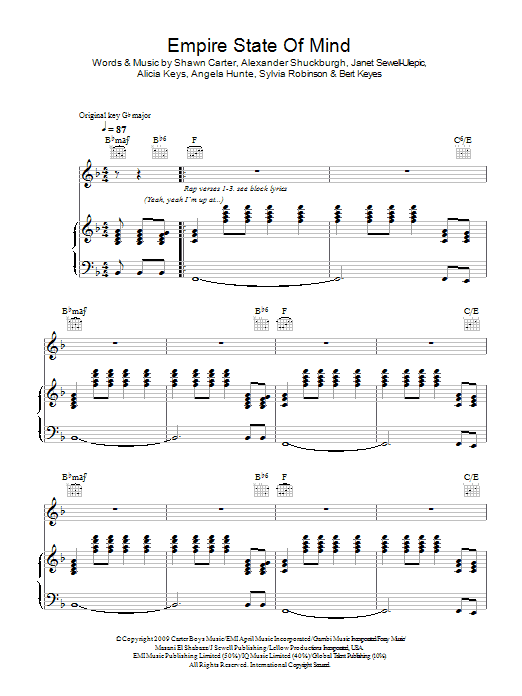Download or print Jay-Z featuring Alicia Keys Empire State Of Mind sheet music, chords and digital score arranged for Piano, Vocal & Guitar Chords (Right-Hand Melody). This Pop score includes 6 page(s).