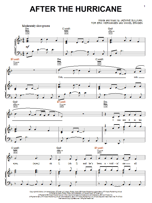 Download or print Jazmine Sullivan After The Hurricane sheet music, chords and digital score arranged for Piano, Vocal & Guitar Chords (Right-Hand Melody). This Pop score includes 7 page(s).