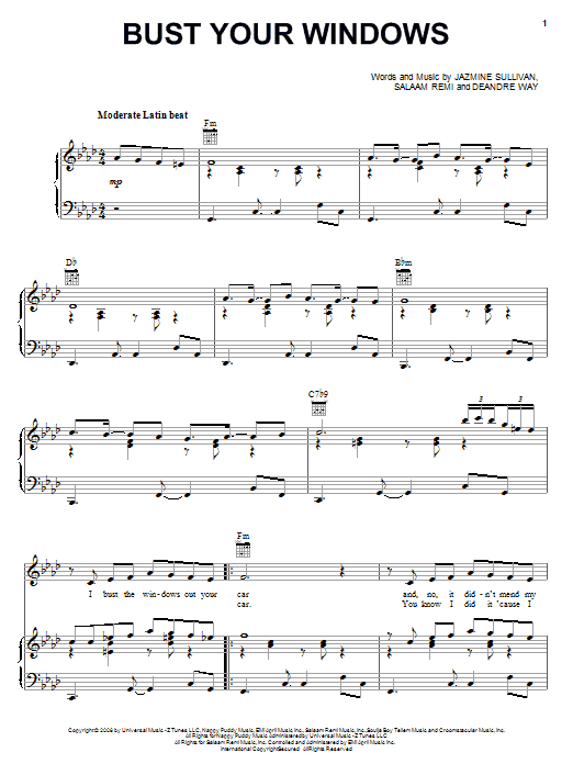 Download or print Jazmine Sullivan Bust Your Windows sheet music, chords and digital score arranged for Piano, Vocal & Guitar Chords (Right-Hand Melody). This Film/TV score includes 7 page(s).