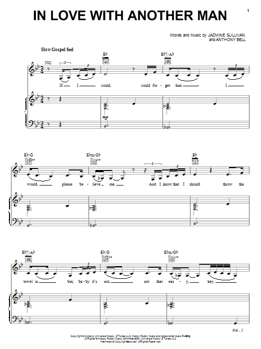 Download or print Jazmine Sullivan In Love With Another Man sheet music, chords and digital score arranged for Piano, Vocal & Guitar Chords (Right-Hand Melody). This Pop score includes 8 page(s).