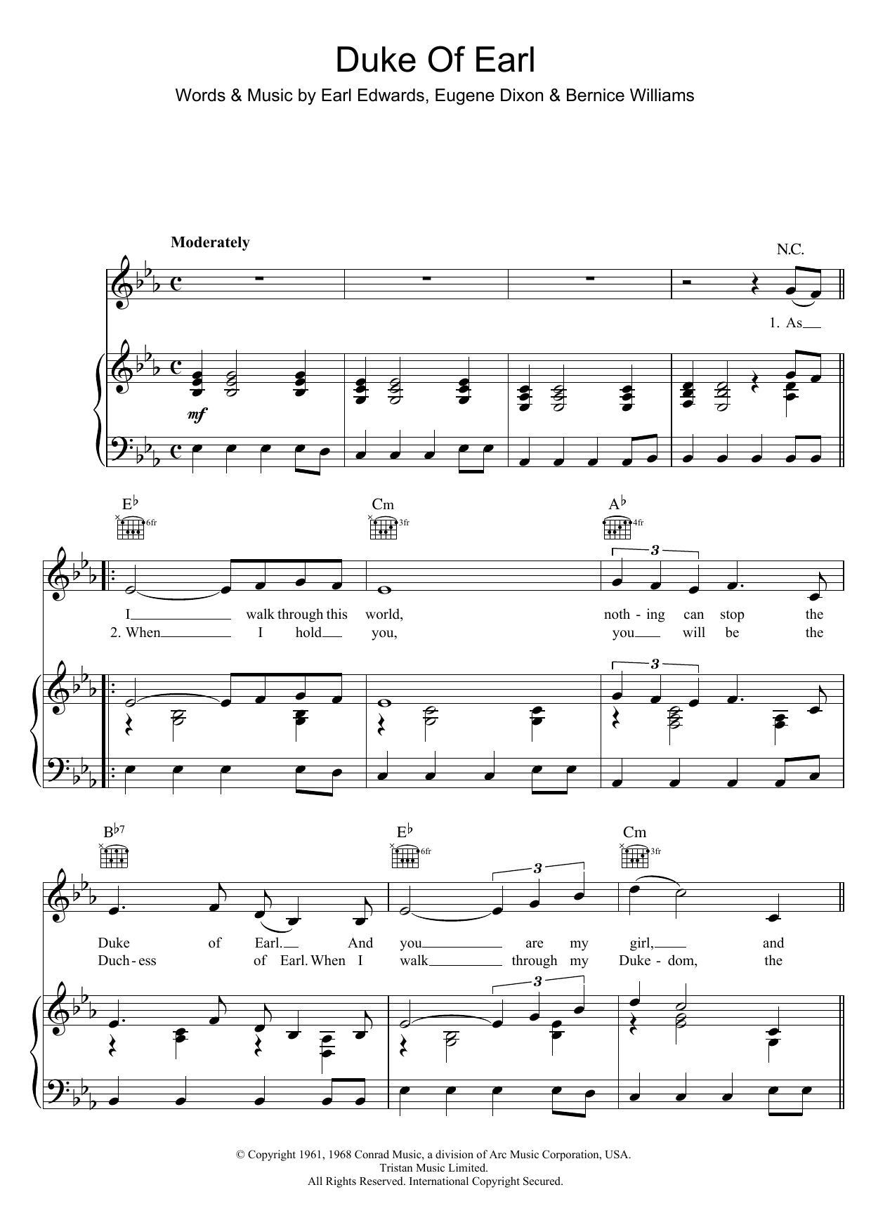 Download or print Jean Chandler Duke Of Earl sheet music, chords and digital score arranged for Piano, Vocal & Guitar Chords (Right-Hand Melody). This Standards score includes 2 page(s).