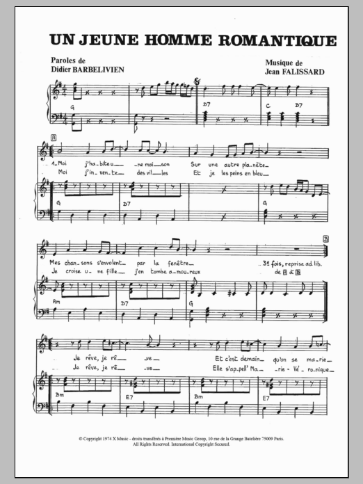 Download or print Jean Falissard Un Jeune Homme Romantique sheet music, chords and digital score arranged for Piano & Vocal. This French score includes 2 page(s).