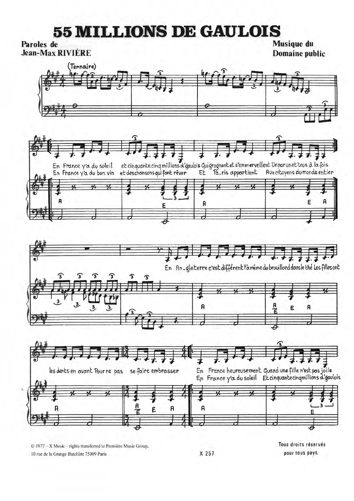 Download or print Jean-Max Riviere 55,000,000 De Gaulois sheet music, chords and digital score arranged for Piano & Vocal. This Pop score includes 3 page(s).