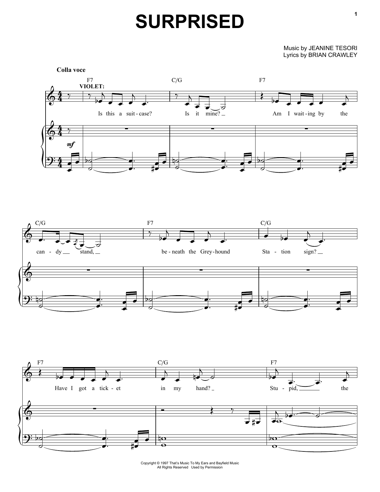 Download or print Jeanine Tesori Surprised sheet music, chords and digital score arranged for Piano & Vocal. This Musical/Show score includes 9 page(s).
