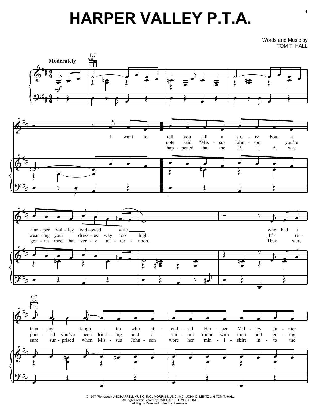 Download or print Jeannie C. Riley Harper Valley P.T.A. sheet music, chords and digital score arranged for Guitar Chords/Lyrics. This Country score includes 3 page(s).