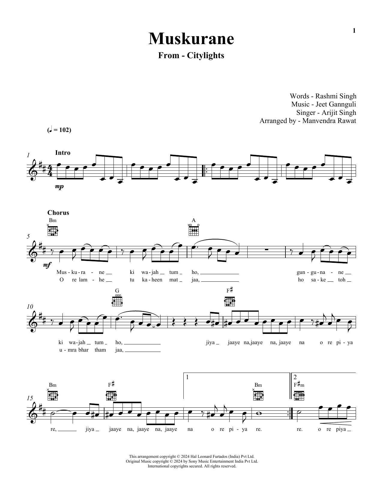 Download or print Jeet Gannguli and Arijit Singh Muskurane (from Citylights) sheet music, chords and digital score arranged for Lead Sheet / Fake Book. This Hindi score includes 3 page(s).