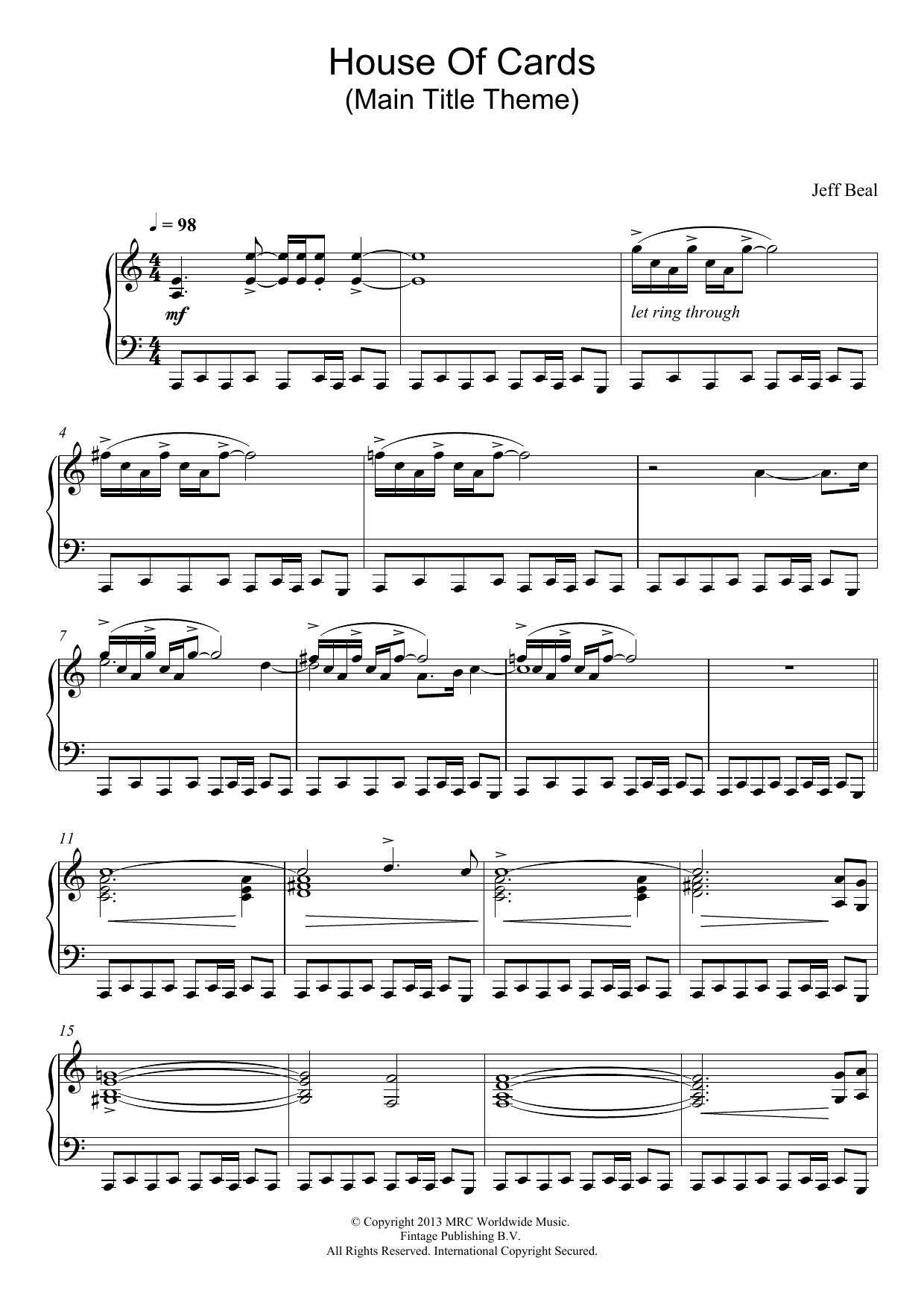 Download or print Jeff Beal House Of Cards (Main Title Theme) sheet music, chords and digital score arranged for Piano Solo. This Film/TV score includes 2 page(s).