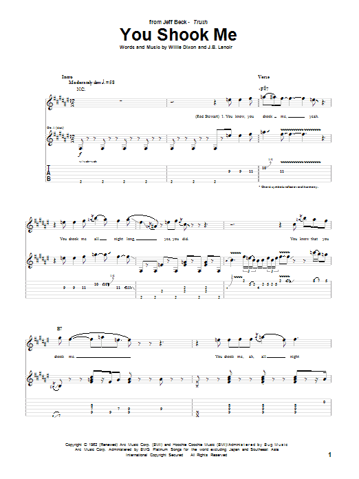 Download or print Jeff Beck You Shook Me sheet music, chords and digital score arranged for Guitar Tab. This Blues score includes 4 page(s).