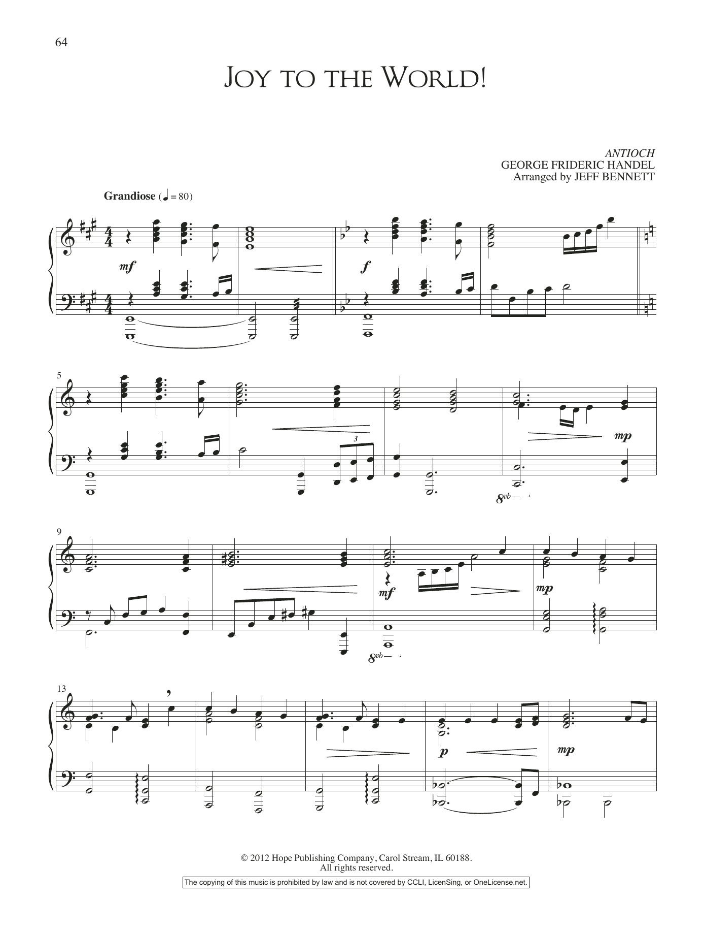 Download or print Jeff Bennett Joy to the World! sheet music, chords and digital score arranged for Piano Solo. This Hymn score includes 4 page(s).