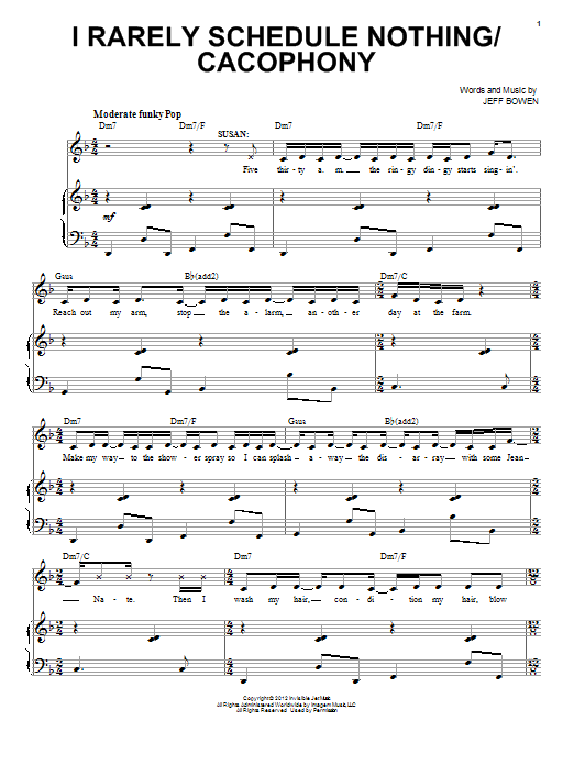 Download or print Jeff Bowen I Rarely Schedule Nothing/Cacophony sheet music, chords and digital score arranged for Piano, Vocal & Guitar Chords (Right-Hand Melody). This Pop score includes 11 page(s).