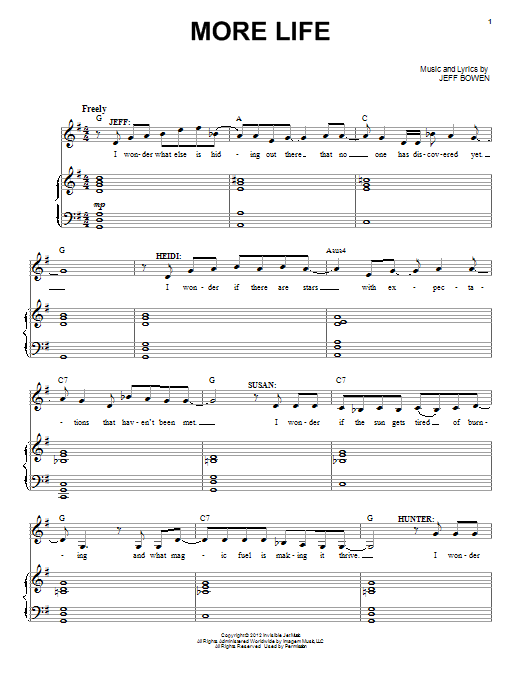 Download or print Jeff Bowen More Life sheet music, chords and digital score arranged for Piano & Vocal. This Musical/Show score includes 11 page(s).