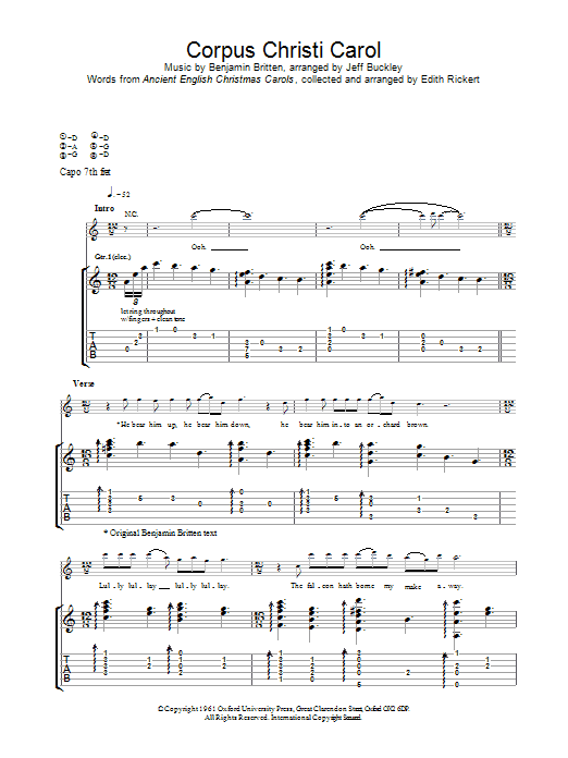 Download or print Jeff Buckley Corpus Christi Carol sheet music, chords and digital score arranged for Guitar Tab. This Pop score includes 4 page(s).
