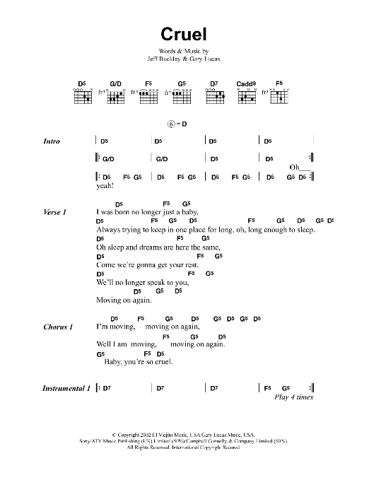 Download or print Jeff Buckley Cruel sheet music, chords and digital score arranged for Guitar Chords/Lyrics. This Rock score includes 3 page(s).