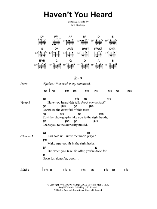 Download or print Jeff Buckley Haven't You Heard sheet music, chords and digital score arranged for Guitar Chords/Lyrics. This Rock score includes 3 page(s).