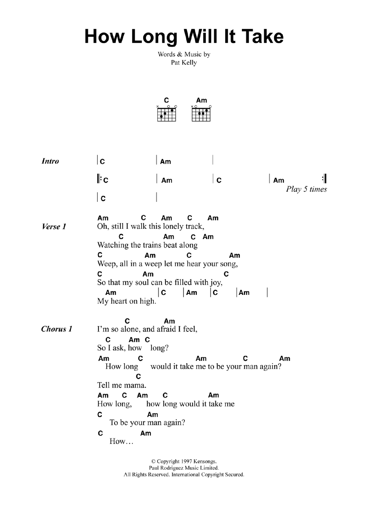 Download or print Jeff Buckley How Long Will It Take sheet music, chords and digital score arranged for Guitar Chords/Lyrics. This Rock score includes 2 page(s).