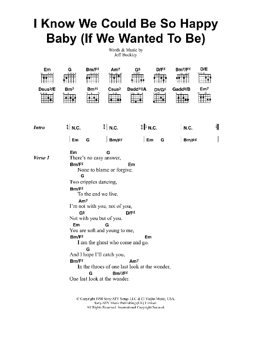Download or print Jeff Buckley I Know We Could Be So Happy Baby (If We Wanted To Be) sheet music, chords and digital score arranged for Guitar Chords/Lyrics. This Rock score includes 3 page(s).