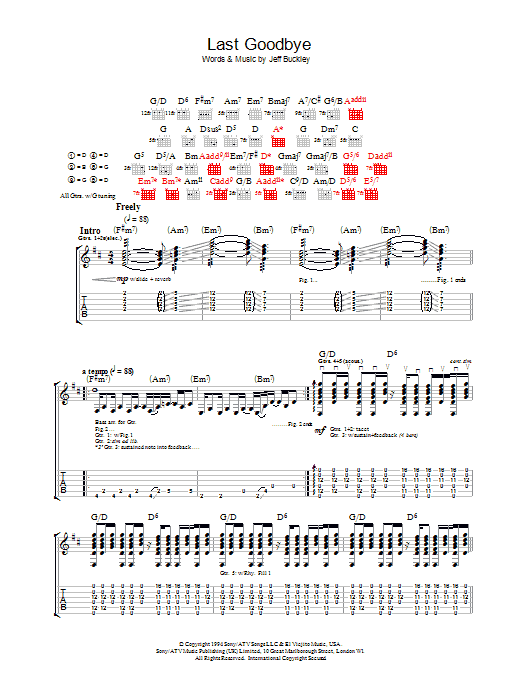 Download or print Jeff Buckley Last Goodbye sheet music, chords and digital score arranged for Piano, Vocal & Guitar Chords. This Rock score includes 7 page(s).