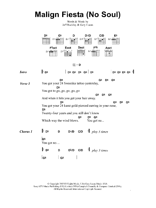 Download or print Jeff Buckley Malign Fiesta (No Soul) sheet music, chords and digital score arranged for Guitar Chords/Lyrics. This Rock score includes 3 page(s).