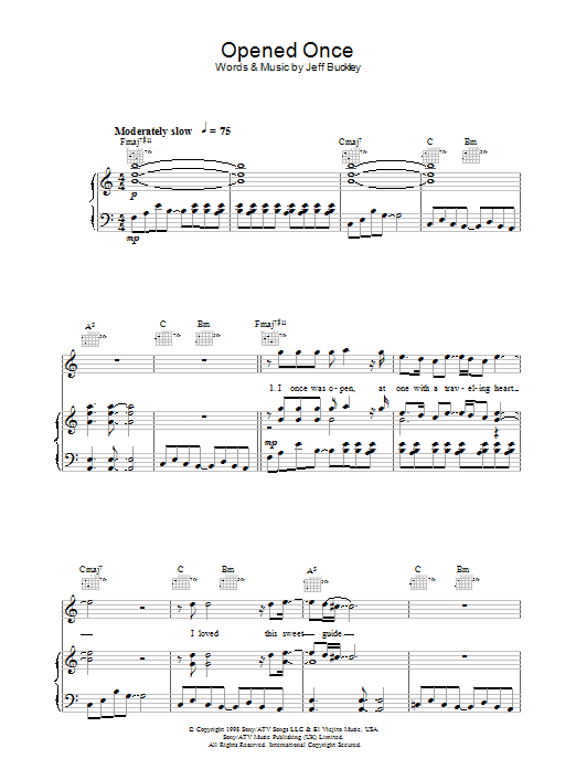 Download or print Jeff Buckley Opened Once sheet music, chords and digital score arranged for Piano, Vocal & Guitar Chords. This Rock score includes 5 page(s).