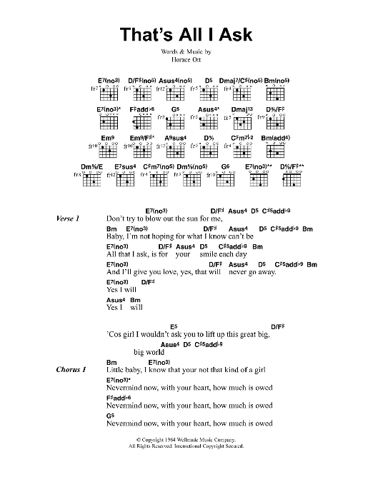 Download or print Jeff Buckley That's All I Ask sheet music, chords and digital score arranged for Guitar Chords/Lyrics. This Rock score includes 3 page(s).