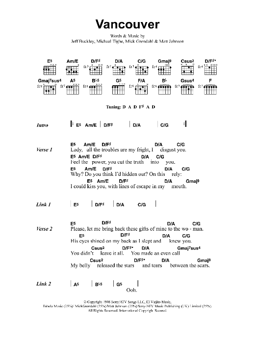 Download or print Jeff Buckley Vancouver sheet music, chords and digital score arranged for Guitar Chords/Lyrics. This Rock score includes 2 page(s).