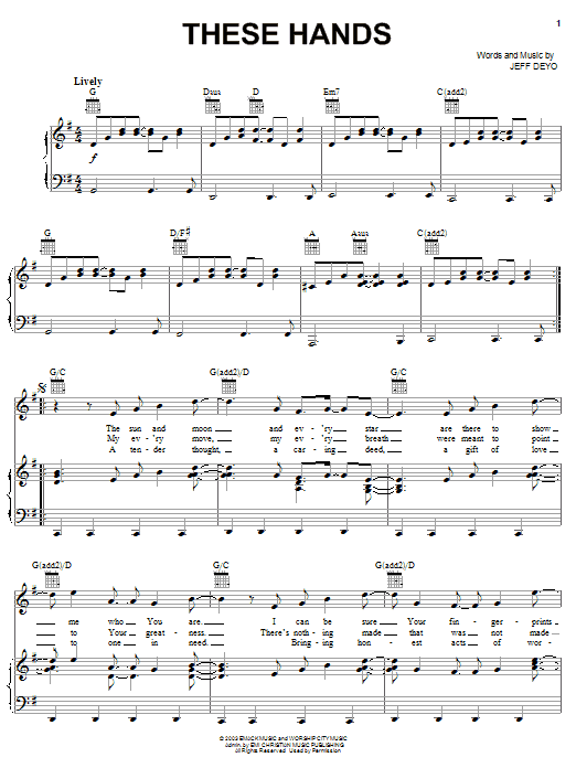 Download or print Jeff Deyo These Hands sheet music, chords and digital score arranged for Piano, Vocal & Guitar Chords (Right-Hand Melody). This Christian score includes 6 page(s).