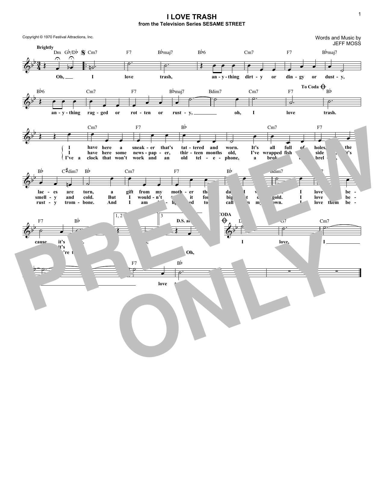 Download or print Jeff Moss I Love Trash (from Sesame Street) sheet music, chords and digital score arranged for Lead Sheet / Fake Book. This Children score includes 1 page(s).