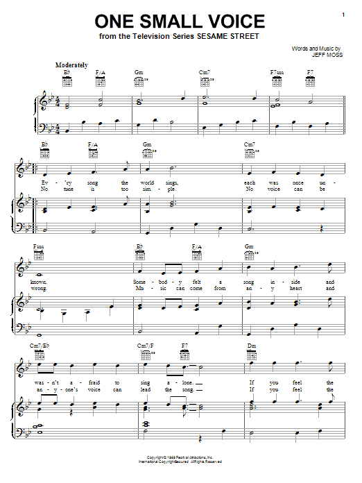 Download or print Jeff Moss One Small Voice sheet music, chords and digital score arranged for Piano, Vocal & Guitar Chords (Right-Hand Melody). This Children score includes 3 page(s).