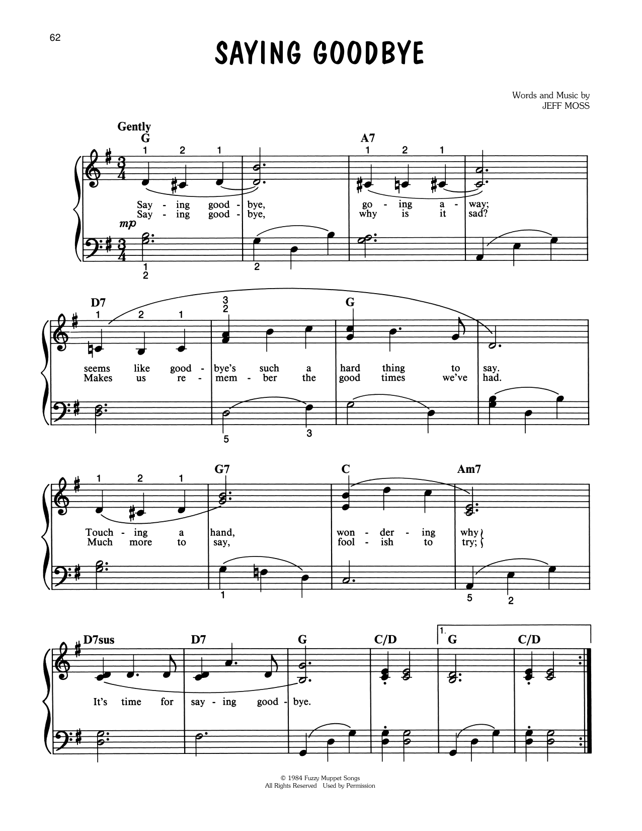 Download or print Jeff Moss Saying Goodbye (from The Muppets Take Manhattan) sheet music, chords and digital score arranged for Piano, Vocal & Guitar Chords (Right-Hand Melody). This Children score includes 4 page(s).