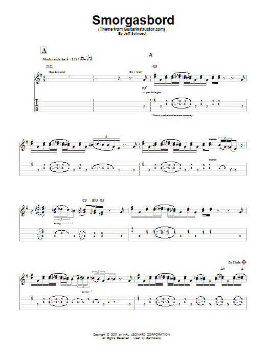 Download or print Jeff Schroedl Smorgasbord (Theme from GuitarInstructor.com) sheet music, chords and digital score arranged for Guitar Tab. This Funk score includes 5 page(s).