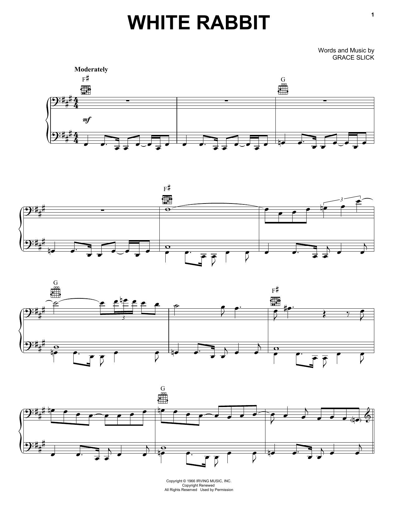 Download or print Jefferson Airplane White Rabbit sheet music, chords and digital score arranged for Guitar Chords/Lyrics. This Rock score includes 2 page(s).