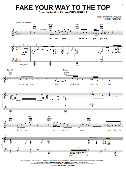Download or print Jennifer Hudson Fake Your Way To The Top sheet music, chords and digital score arranged for Piano, Vocal & Guitar Chords (Right-Hand Melody). This Film/TV score includes 9 page(s).