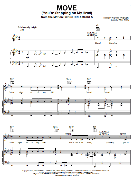 Download or print Jennifer Hudson Move (You're Stepping On My Heart) sheet music, chords and digital score arranged for Piano, Vocal & Guitar Chords (Right-Hand Melody). This Film/TV score includes 7 page(s).