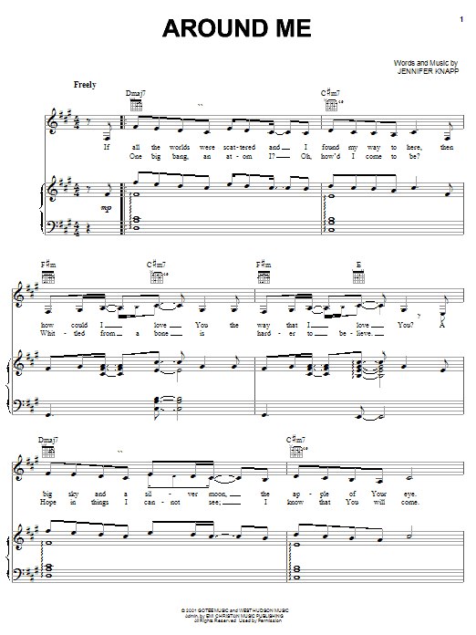 Download or print Jennifer Knapp Around Me sheet music, chords and digital score arranged for Piano, Vocal & Guitar Chords (Right-Hand Melody). This Christian score includes 4 page(s).