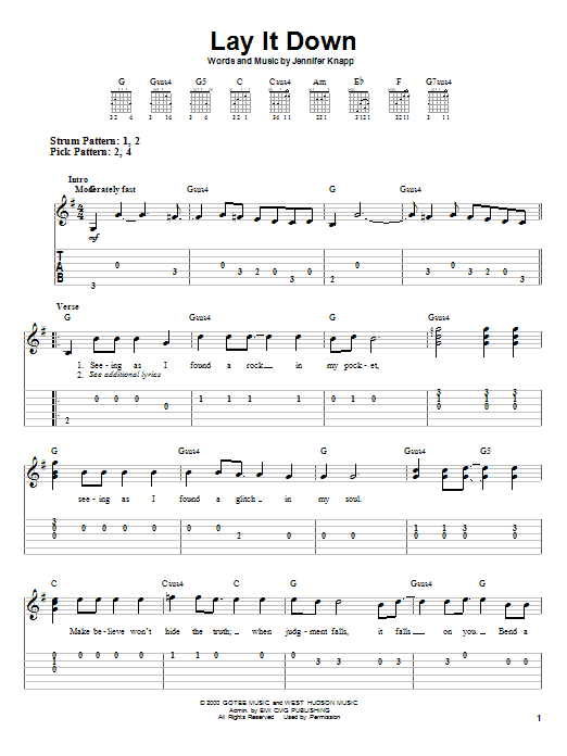 Download or print Jennifer Knapp Lay It Down sheet music, chords and digital score arranged for Piano, Vocal & Guitar Chords (Right-Hand Melody). This Christian score includes 7 page(s).