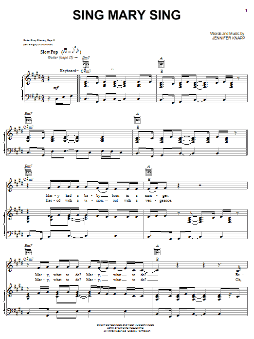 Download or print Jennifer Knapp Sing Mary Sing sheet music, chords and digital score arranged for Piano, Vocal & Guitar Chords (Right-Hand Melody). This Christian score includes 5 page(s).