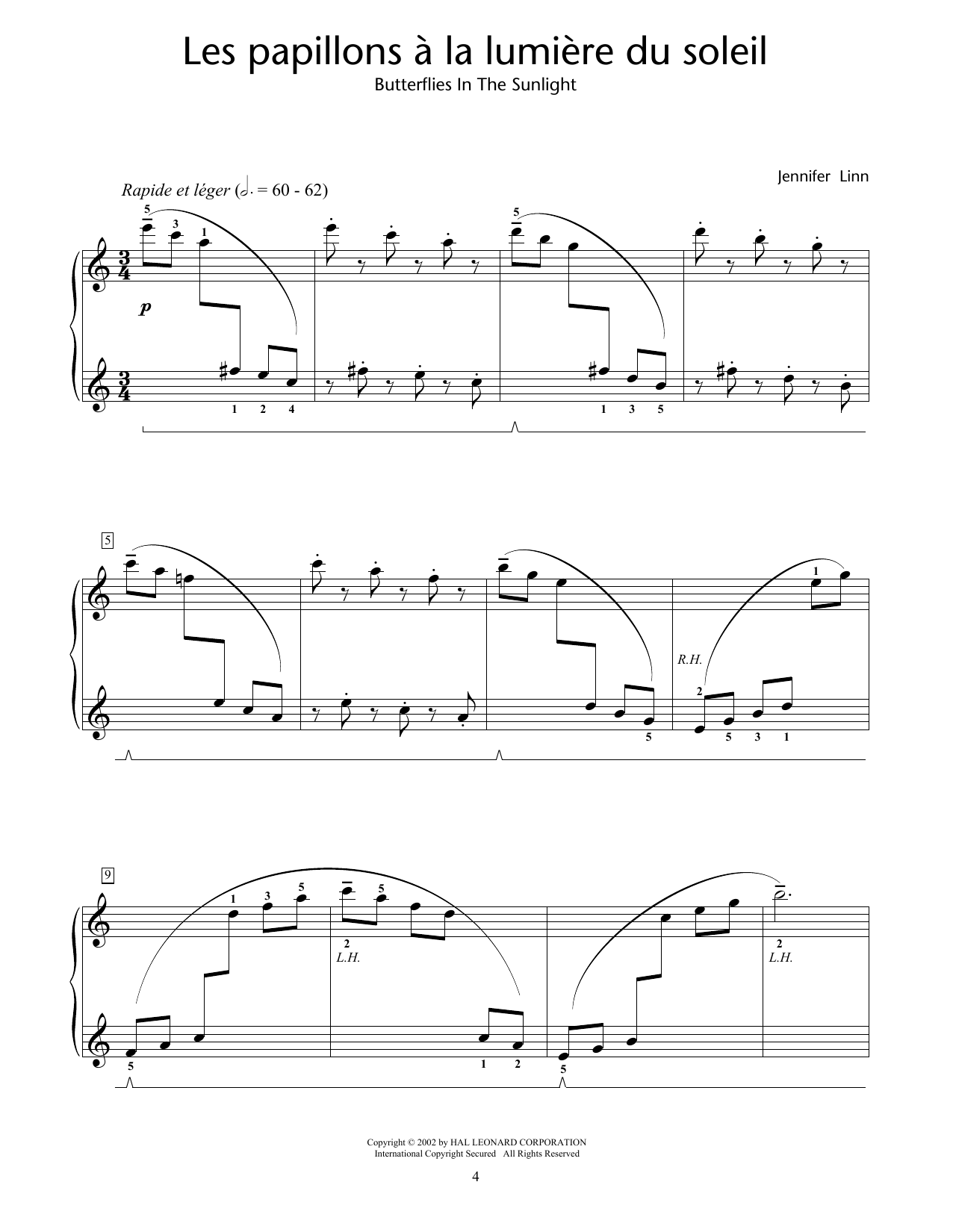 Download or print Jennifer Linn Les papillons a la lumiere du soleil (Butterflies In The Sunlight) sheet music, chords and digital score arranged for Educational Piano. This French score includes 4 page(s).