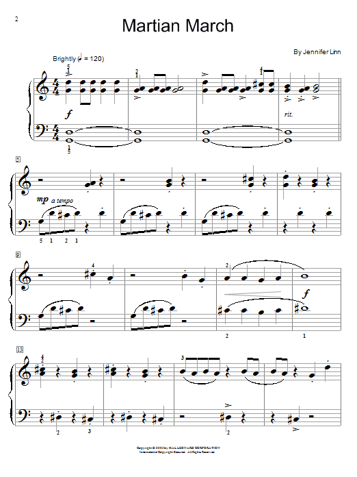 Download or print Jennifer Linn Martian March sheet music, chords and digital score arranged for Educational Piano. This Children score includes 2 page(s).