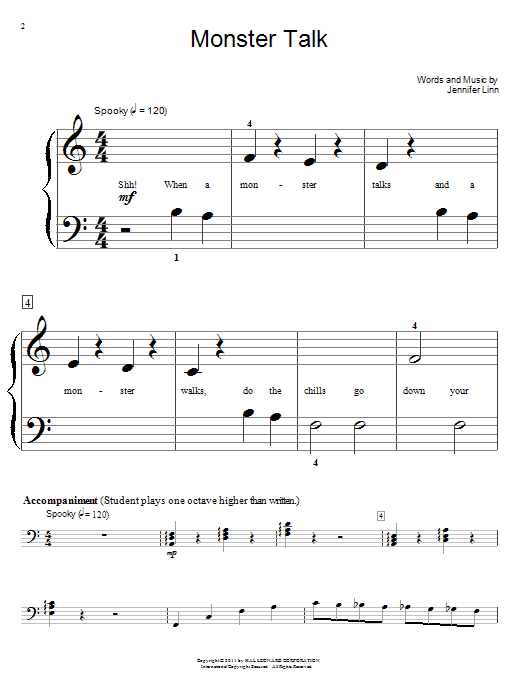 Download or print Jennifer Linn Monster Talk sheet music, chords and digital score arranged for Educational Piano. This Pop score includes 3 page(s).