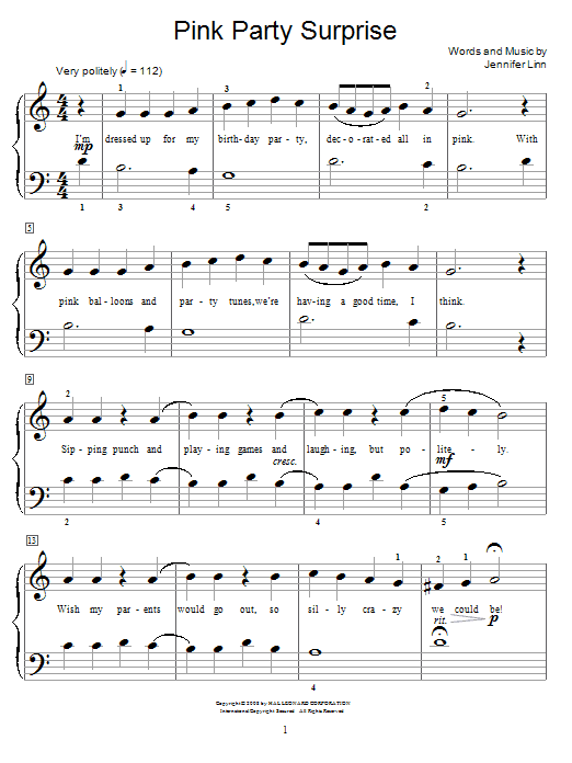 Download or print Jennifer Linn Pink Party Surprise sheet music, chords and digital score arranged for Educational Piano. This Children score includes 2 page(s).