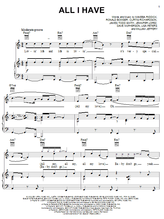 Download or print Jennifer Lopez featuring LL Cool J All I Have sheet music, chords and digital score arranged for Piano, Vocal & Guitar Chords (Right-Hand Melody). This Hip-Hop score includes 8 page(s).