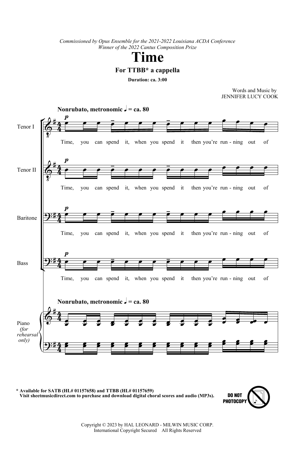 Download or print Jennifer Lucy Cook Time sheet music, chords and digital score arranged for SSAA Choir. This Festival score includes 17 page(s).