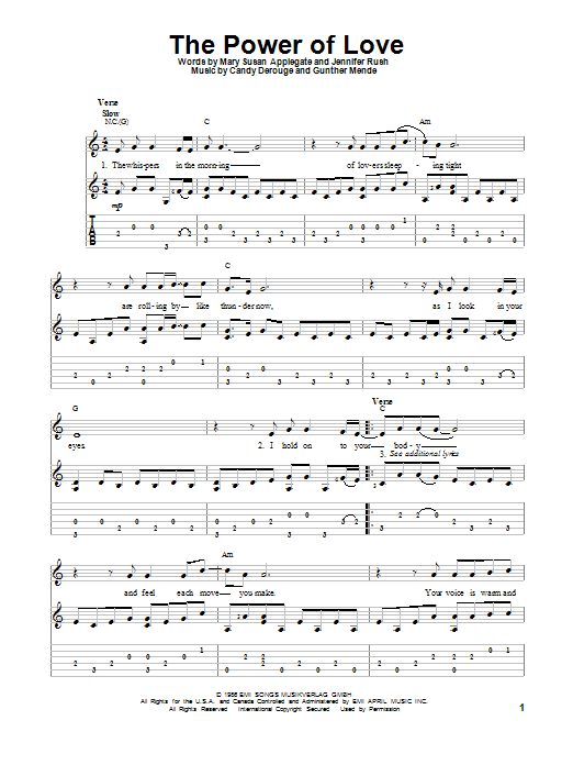 Download or print Jennifer Rush The Power Of Love sheet music, chords and digital score arranged for Solo Guitar. This Love score includes 4 page(s).
