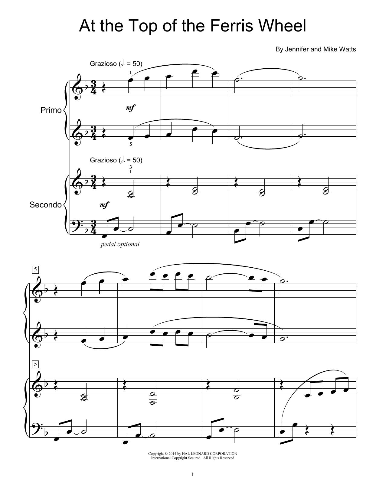 Download or print Jennifer Watts At The Top Of The Ferris Wheel sheet music, chords and digital score arranged for Piano Duet. This Children score includes 3 page(s).