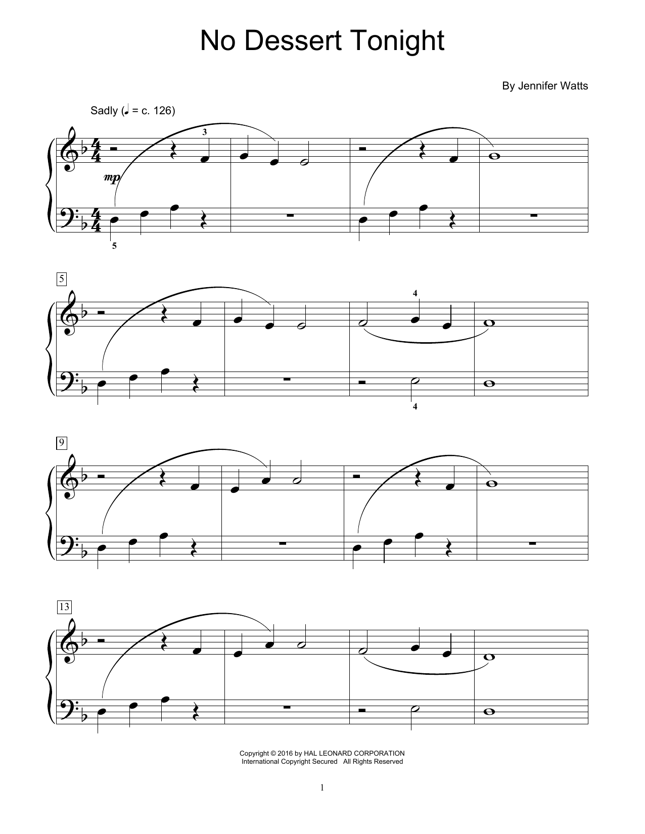 Download or print Jennifer Watts No Dessert Tonight sheet music, chords and digital score arranged for Educational Piano. This Instructional score includes 2 page(s).