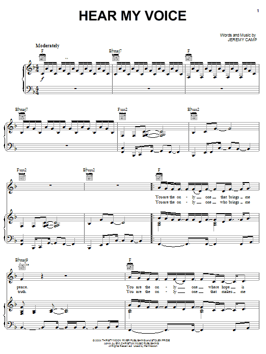 Download or print Jeremy Camp Hear My Voice sheet music, chords and digital score arranged for Piano, Vocal & Guitar Chords (Right-Hand Melody). This Christian score includes 5 page(s).