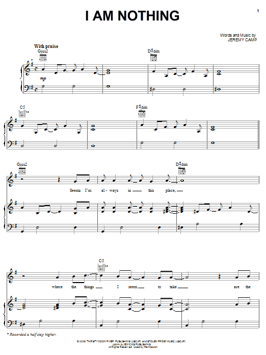 Download or print Jeremy Camp I Am Nothing sheet music, chords and digital score arranged for Piano, Vocal & Guitar Chords (Right-Hand Melody). This Christian score includes 9 page(s).